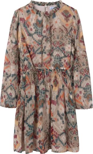 This delightful long-sleeve dress features elastic cuffs for a snug fit and a round neckline adorned with a charming ruffle. A small button closure at the back ensures easy dressing. This model showcases honeycomb detailing and a beautiful printed design, making it a lovely addition to any wardrobe. Perfect for playdates or family gatherings, this dress combines comfort and style effortlessly.