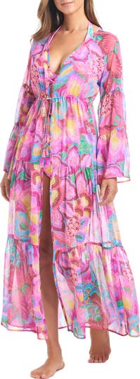 Saunter between cabana and tiki bar in this colorfully print cover-up dress that s cinched with trailing trassel ties for a beachy look.