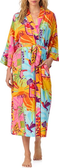 Stay in for the evening wearing this romantic robe designed in a vibrant pattern with flowy sleeves and a defining waist tie.