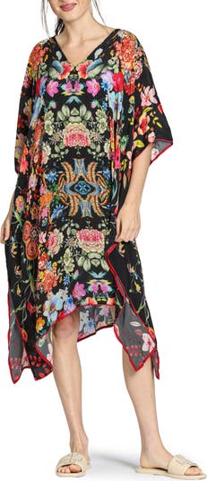 Chic has never been easier to achieve than this vividly patterned caftan cut with a shark-bite hem from a superlightweight blend of silky cupro and viscose.