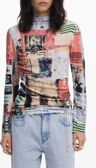 A mix of charming prints create an enchanting scene on this close-fitting top made with a sophisticated mock neck.