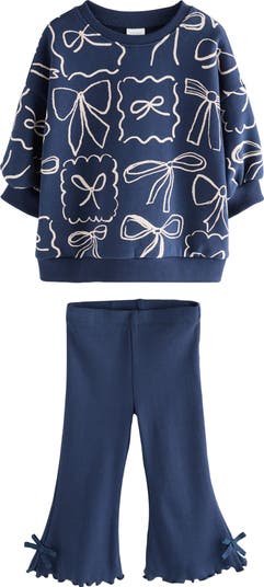 A raglan-sleeve sweatshirt is illustrated with bows and paired with ribbed and flared leggings in this cute and comfy set.