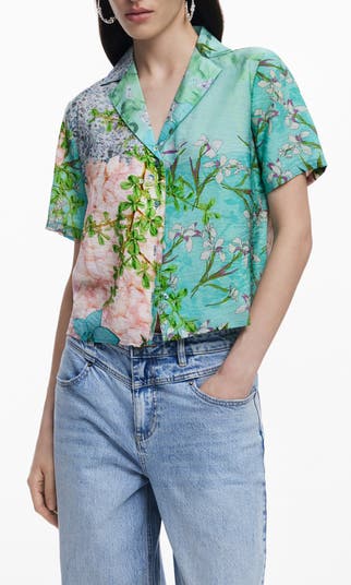 A vivid print jazzes up this boxy button-up shirt made with a softly crinkled texture.