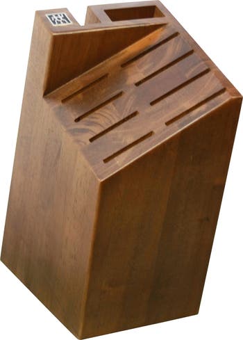 Keep your knives and other kitchen utensils safely stored in this sturdy knife block made of walnut wood. This block set fits eight knives, one pair of kitchen shears and one sharpening steel rod.
