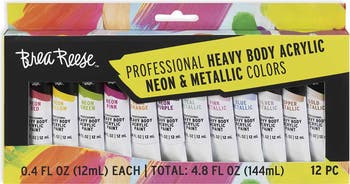 BREA REESE: PROFESSIONAL HEAVY BODY ACRYLIC SET 12 COUNT - NEON METALLIC - Make a bold statement with the Brea Reese Professional Heavy Body Acrylic Set - Neon Metallic, a collection designed for artists who want to bring their work to life with vibrant neon and shimmering metallics. This 12-piece set offers a dynamic range of eye-catching colors that are perfect for blending, mixing, and creating unique, impactful art. The heavy body formula provides exceptional texture retention, ensuring that your work has the bold dimension and vivid color you need to make it stand out. Whether you’re working on modern abstract art, mixed media projects, or adding bold highlights to traditional pieces, this set delivers professional-grade results. This set is ideal for adding bright pops of color to city scenes, metallic accents to nightscapes, or blending neons into modern designs. The non-toxic, water-based formulation ensures easy handling, while the rich pigment concentration guarantees lasting vibrancy in your artwork. Perfect for artists who want to explore new color possibilities and bring their creative visions to life. Paint Set INCLUDES 12 tubes of acrylic paint.