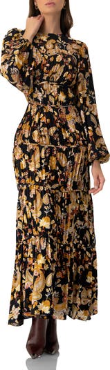 - Printed maxi dress with a round neckline and long puff sleeves.