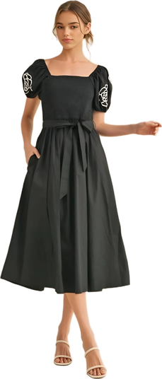 - Smocked bodice, embroidered puff sleeves, tie waist, flowy A-line skirt with pockets