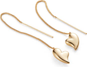 Puffy molten hearts are suspended from a slender chain on gorgeous threader earrings.