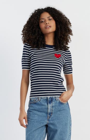 Our iconic Heart Breton is reimagined in this luxurious pure merino. This cream and navy striped short sleeve T-shirt is shaped for a slim fit and features a red heart.