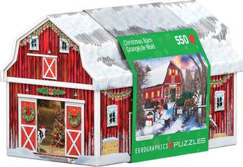 EUROGRAPHICS: CHRISTMAS BARN SHAPED TIN - 550 PIECE JIGSAW PUZZLE. Celebrate Christmas with a charming twist courtesy of the Eurographics Christmas Barn Shaped Tin 550 Piece Jigsaw Puzzle! This delightful puzzle set features 550 pieces nestled within a beautifully crafted Holiday Barn shaped tin, adding a nostalgic touch to your holiday decor. Measuring a cozy 13" x 19" when completed, it s perfect for solo puzzling sessions or as a shared activity during family gatherings. Crafted from premium, eco-friendly materials including 100% recycled European blue board and printed with non-toxic vegetable-based inks, this puzzle is as sustainable as it is enjoyable. The sturdy tin not only protects your puzzle pieces but also serves as a decorative keepsake, ensuring your puzzle can be proudly displayed wherever you choose. Whether adorning your family table, coffee table, or accompanying you on travels thanks to its convenient snap closure, this puzzle promises hours of festive fun. Ideal for both casual solvers and hobby enthusiasts alike, it s a thoughtful Christmas gift that combines entertainment with eco-conscious craftsmanship. Embrace the holiday spirit with the Eurographics Christmas Barn Shaped Tin Puzzle—a must-have addition to your seasonal traditions and decor.