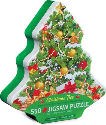 EUROGRAPHICS: CHRISTMAS TREE SHAPED TIN - 550 PIECE JIGSAW PUZZLE. Celebrate the holidays with the delightful Eurographics Christmas Tree Shaped Tin Jigsaw Puzzle! This festive collectible puzzle set features a charming Christmas tree-shaped tin, a poster, and a 550-piece puzzle, making it a perfect holiday gift. The completed puzzle measures 13" x 19", providing an ideal size for family tables, coffee tables, or game tables. This 550-piece puzzle is the perfect blend of entertaining and challenging, suitable for both casual solvers and hobby enthusiasts. It’s also time-friendly, making it a great activity for solo puzzling or for family and group gatherings. The high-quality Christmas tree-shaped tin is not just packaging—it serves as a nostalgic display piece, allowing you to keep your puzzle safe and accessible without hiding it away in storage. The convenient snap tin design makes this puzzle set great for travel, ensuring you won t lose pieces along the way. Expertly crafted with sustainability in mind, this puzzle is made from premium, high-quality, 100% recycled European blue board and printed with non-toxic vegetable-based ink. Enjoy the festive season with the Eurographics Christmas Tree Shaped Tin Jigsaw Puzzle. It’s the perfect Christmas gift for puzzle lovers and a fantastic addition to your holiday traditions. Celebrate the joy of the season with this charming and collectible puzzle set, creating lasting memories with family and friends!