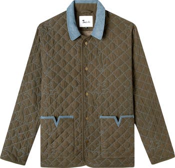 - Olive green quilted jacket with all-over embroidery of hunting dogs and ducks in blue stitching.