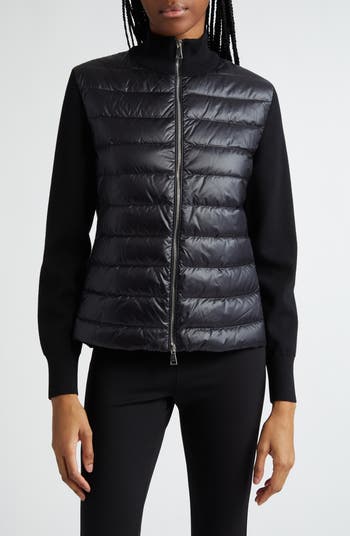 Part puffer, part cardigan, this hybrid style with a stand collar combines virgin-wool knit sleeves with a down-filled quilted nylon core.
