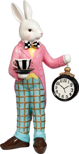 The Mark Roberts Easter décor rabbit stands 18.5 inches tall and is beautifully detailed for seasonal display. The rabbit is holding a decorative clock along with a charming cup and saucer for a whimsical touch. This elegant figurine adds a playful yet refined accent to spring and Easter décor.