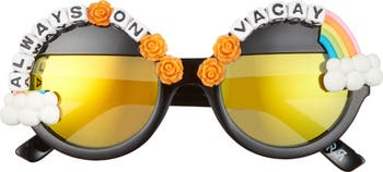 Take vacation vibes with you everywhere you go in these retro-chic round sunglasses accented with flowers and beads.