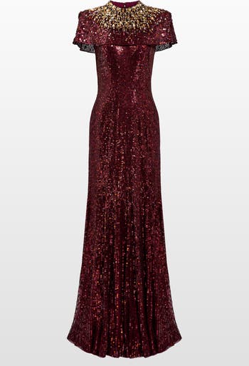 This floor-length gown pairs refined glamour with distinctive detailing. The fitted silhouette is enhanced by a high neckline and an embellished cape overlay that adds dimension and subtle drama. Sequins arranged throughout the design create a soft, light-catching shimmer, while the fluid skirt offers graceful movement. A striking choice for evening occasions that call for timeless sophistication with a contemporary twist.