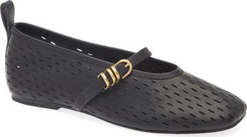 A square toe fronts this leather flat featuring mesh-like perforations and a distinctive buckle strap with extra D-ring keepers—a signature of the Spire line.