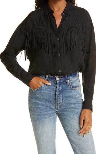Get into a western state of mind in a blouse made from a silk-like cupro-blend and accented with a swingy fringe on the yoke.