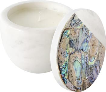 The Rainbow Eucalyptus White Marble Candle is crafted with 100% Soy Wax. The Mother of Pearl detailing boasts a natural iridescent rainbow hue. Illuminate your space with elegance and serenity. Each piece is lovingly handcrafted in the city of Agra, the very home of the Taj Mahal. These artisans have inherited and perfected their intricate hand-carving techniques through generations, ensuring that each creation is a masterpiece of timeless craftsmanship. Extend the life of this exquisite marble vessel and make it a timeless addition to your decor for years to come. Every item is wrapped in an elegant white gift box, adorned with a luxurious silky matte paper, with the Anaya logo in a subtle gold foil. 100% Natural Eucalyptus Essential Oils 100% Soy Wax, Cotton lead free Wick. Size: 4" D x 4. 5"H. White Marble, Mother of Pearl Shell. Made in India.