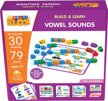 RAINBOW PHONICS BLOX: VOWEL SOUNDS - PHASE 5 - Vowel Sounds by Phonics Blox covers short vowels, long vowels and various vowel digraphs including the magic e. This set comes with 30 activity cards, designed to follow a systematic phonics progression covering phase 5 of Rainbow Phonics. Each activity card provides a part list and word building examples. A fun and engaging way to learn vowel sounds! Each box contains all the Blox needed for completing every activity in the set. Phonics Blox is a comprehensive, interactive, and educational tool for mastering reading and enhancing phonics skills. Easy for students, teachers, instructors and parents to use.