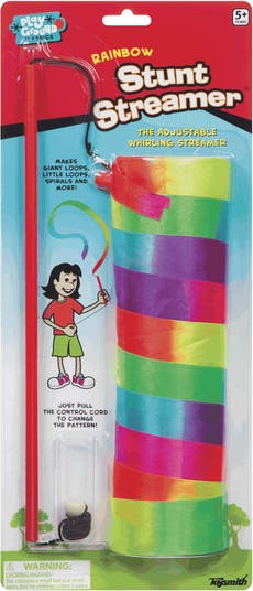 The Toysmith rainbow stunt Streamer provides hours of active outdoor fun. This multi-colored stunt Streamer stretches to 6.5-Feet in length, creating huge, fluid shapes when it moves. Pull the control cord at the end of the handle to create loops, spirals, and more. The brightly colored Streamer resists tears and stains, and holds up under hours of intense play. Suitable for outdoor play only.