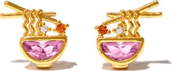 Treat yourself to these whimsical ramen stud earrings sparkling with colorful cubic zirconia.