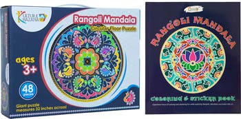 RANGOLI MANDALA BUNDLE: PUZZLE COLORING + STICKER BOOK - A fun cultural bundle with Rangoli Mandala Circular Floor Puzzle and Rangoli Mandala Coloring + Sticker Book by Kulture Khazana. Explore Indian folk art, Rangoli floor art, and Mandalas. The 48-piece Rangoli Mandala Circular Floor Puzzle by Kulture Khazana is HUGE at 32 inches across. Learn about South Asian culture, celebrate Indian festivals and diversify your playroom with Rangoli Mandala Floor Puzzle. Hours of coloring and stickering fun in Rangoli Mandala Coloring and Sticker Book by Kulture Khazana. Color the unique South Asian cultural designs. You can create your own ones using the sticker sheets. The book includes 30 perforated coloring sheets, 5 sticker sheets, and 5 Mandala outlines. Enjoy screen-free, stress-relieving, engaging, mindful activity while exploring Indian art forms for ages 3 and up. Kulture Khazana is focused on developing a product line that helps families make heritage and culture accessible and shareable. Kulture Khazana LLC was founded in 2018 with the goal of sharing Indian cultural stories with children through educational and play activities. Today, their collection of affordable and accessible books, toys, games, and online story albums can be found in homes, schools, and libraries around the world. Whether you’re a parent, a library, a media outlet or kids looking to have fun, building community starts with the treasures of home, and we’re here to help bring them to you.