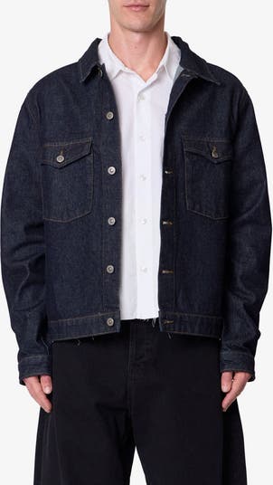 This denim jacket features a classic trucker silhouette with flap pockets and metal tack buttons for an authentic look. It s finished with a light rinse to keep it dark and sewn with contrast gold stitching throughout.