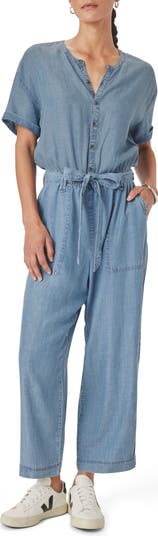 Abbreviated cuff sleeves frame this soft chambray jumpsuit made with a defining tie belt.