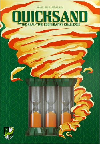 QUICKSAND - QuicksandTM is a real-time cooperative challenge where you work together to deactivate the Quicksand, an ancient apparatus of gears and sand. The Quicksand is a tricky contraption, you can’t act too fast nor too slow or it will trigger: only perfect teamwork will allow you to disable this ancient apparatus. In turns, you play cards to flip and advance one or more sand timers; your goal is to prevent any of them from running out before you deactivate the contraption. Sand timers rest on Gear tiles, each distinguished by a different combination of shape and color. Each of your cards depicts only 1 shape -or- 1 color among all those available, and when you play a card, all sand timers on matching tiles are flipped and advanced to the next tile–whether you want them to or not. Flip a sand timer too soon and you can get into trouble all by yourself... but if you wait too long, game over will be inevitable. You will have to coordinate strategically as a team to deactivate the Quicksand before the sand timers run out!