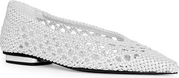 A pointy cap toe and intricately braided faux-leather upper highlight the streamlined profile of a stylish flat set on a cushioned footbed for optimal comfort.