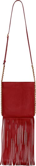 Fringed trim adds a fun flourish to a leather crossbody bag fashioned with an ultraslim profile to make it an easy option on festival days or weekend outings.