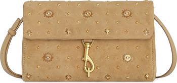 Metallic stars and evil-eye motifs bring celestial shine to this soft suede crossbody bag featuring polished hardware and an adjustable, removable strap.