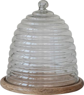 This reclaimed glass beehive shaped cloche with mango wood base is an exquisite and versatile serveware piece that can add elegance to any setting. The beehive shape of the cloche provides a distinctive design that is both functional and decorative. Crafted from reclaimed glass, each cloche bears its own unique characteristics. The solid mango wood base complements the clear glass, creating a natural and rustic look suitable for various styles. Whether used to cover cheeses, baked goods, or as an innovative display for cherished items, this cloche serves multiple purposes while enhancing the decor. It also makes for an attractive terrarium when filled with small plants or succulents. With its generous size of 11 inches in diameter and 11.5 inches in height, it s an ideal choice for those who appreciate the blend of traditional and contemporary farmhouse aesthetics.