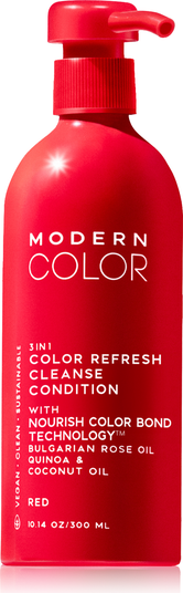Modern Color’s Red 3-in-1 Color Refresh + Cleanse + Conditioner delivers a vibrant red tone while gently cleansing and conditioning in one simple step. This semi-permanent formula refreshes color, boosts shine, and nourishes hair from root to tip. It keeps red-hued and color-treated hair bold and radiant between salon visits without compromising hair health.