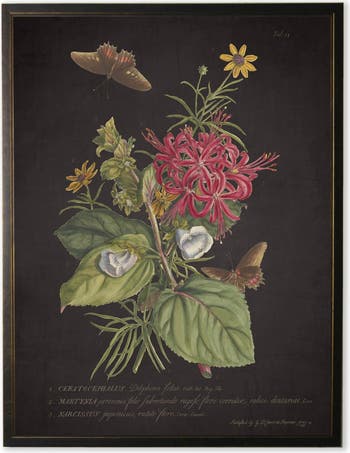 This vintage-inspired print, framed in a copper and black wooden frame, features red and yellow flowers surrounded by butterflies. Sized at 16 inches by 20 inches, this made in the USA frame makes for a beautiful addition to any wall.