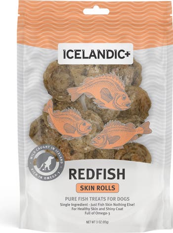 DUP Delicious meets nutritious with our crunchy Redfish Skin Rolls, a natural source of Omega-3 fatty acids for healthy skin and coat. These premium dog treats feature just one ingredient—Icelandic golden redfish—and contain no additives, preservatives or supplements. After being line-caught daily in the icy pure waters of Iceland, our redfish are cleaned. Since these treats feature only one protein source, they are a great choice for dogs with food sensitivities. Plus, they reduce tartar and plaque build-up for healthier teeth and gums. Pure fish treats for dogs. Contains Icelandic golden redfish skins. For healthy skin and a shiny coat. Full of Omega-3 fatty acids. Pure Icelandic fish and nothing else. This Line is caught fresh daily. 100% sustainably fished. 100% edible and digestible. 100% natural, no additives, no preservatives and no supplements. 100% single ingredient dog treat, just fish, nothing else. 100% Viking, air-dried as the Vikings did in 900 A.D. For freshness and convenience, our fish are packaged in a stand-up resealable bag. Each package contains net wt. 3.0 oz. of Icelandic+ Redfish Skin Rolls.