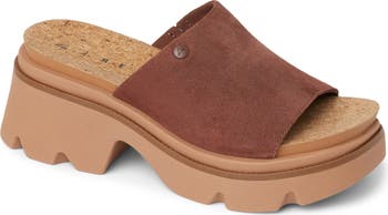 A cushy, contoured cork footbed serves all-day comfort in this lightweight suede sandal grounded by a chunky block heel with deep flex grooves.