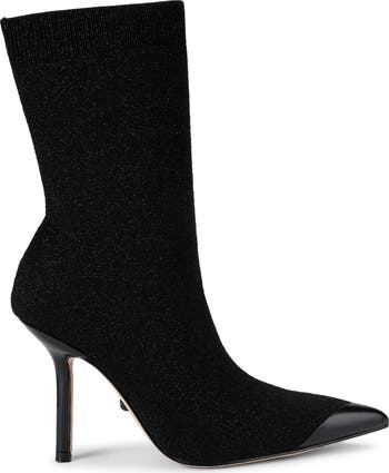 Flecks of metallic illuminate the sock-like upper of a striking bootie featuring a pointy cap toe and svelte stilleto heel for fierce and stylish balance.