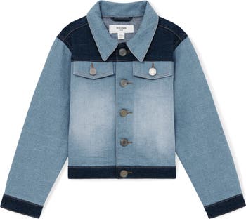Light and dark washes face off in a fashion-forward denim jacket made with just a touch of stretch.