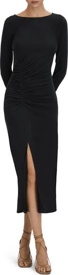A leg-baring slit accents the front of this svelte midi dress completed by a graceful boat neck.