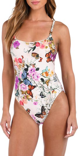 Polished link hardware on the straps brings a hint of golden gleam to this one-piece swimsuit that gets extra support from an underwire and shapely tricot fabric in a gorgeous print.
