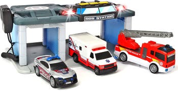 - Rescue station play set includes a police car, fire engine and ambulance (vehicles not battery operated).