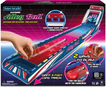 Bring the thrills excitement of the classic arcade Alley Roller home with the Retro Arcade Electronic Alley-Ball game! Just like the arcade version you need to roll the balls down the alley, up the ramp, and into one of the target holes to score points. Each target hole has a different value, so take careful aim and send the ball flying down giant 3-foot (95cm) long track to build up your score. Includes 2 playing options – classic arcade style, in which you aim and roll the ball down the track by hand – or switch over and use the spring-powered ball launcher! Also features single player and 2 player modes – challenge a friend to score as many points as possible in 60 seconds. Features a large LED scoreboard with countdown timer and arcade sound effects. For 1-2 players. Requires 3 x 1.5V AAA batteries (not included). Recommended for ages 6 and over.