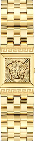 A framed Medusa head fronts the cover of this bracelet watch, putting the aesthetic emphasis on the bracelet aspect and making the precision timepiece within a continual surprise and delight.