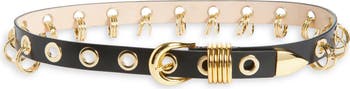 Gleaming hardware rings encircle polished eyelets creating an edgy aesthetic on a supple leather belt that will add a fierce touch to your standout looks.