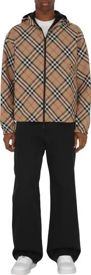 A lightweight twill jacket with a drawcord hood, cut to a relaxed fit. The reversible design switches from the Burberry Check to a solid colour and is appliquéd with our Equestrian Knight Design. Part of Burberry Classics, wardrobe foundations with a unique Burberry slant. ||Two-way zip closure|Drawcord hood and hem|Side zip pockets; reverse press-stud pockets|Elasticated cuffs|Appliquéd Equestrian Knight Design at both sides