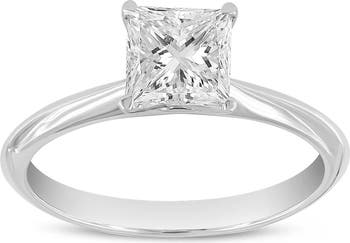 This solitaire ring features a 1.25 carat Princess Cut lab grown diamond elegantly showcased in a classic four prong setting. Handcrafted in 14K gold. The ring is accompanied with an IGI certificate with the certificate number inscribed within the band. Diamond carat weight may fluctuate 0.05 carats ABOVE the stated number.