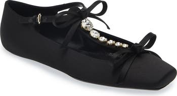 Round-cut rhinestones graduate up the T-strap of this satin ballet flat shaped with a square toe, secured with an ankle strap and made extra charming by a pair of primly tied bows.