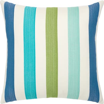 Timeless and modern, the Rhodes Stripe pillow features a fresh approach to a classic cabana stripe with multi-colored saturated bands rich blues and green.